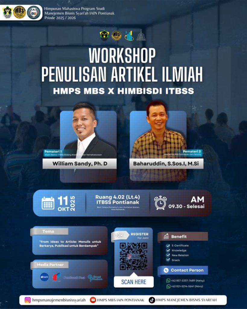 Pontianak, 11 Oktober 2025 — Semangat publikasi ilmiah mahasiswa semakin menggelora melalui kegiatan Workshop Penulisan Artikel Ilmiah yang digelar oleh Himpunan Mahasiswa Program Studi Manajemen Bisnis Syariah (HMPS MBS) Fakultas Ekonomi dan Bisnis Islam (FEBI) Institut Agama Islam Negeri (IAIN) Pontianak bekerja sama dengan Himpunan Mahasiswa Bisnis Digital (HIMBISDI) ITBSS Pontianak. Kegiatan ini berlangsung di Ruang 4.02, Lantai 4, Kampus ITBSS Pontianak, dengan menghadirkan dua narasumber inspiratif.
