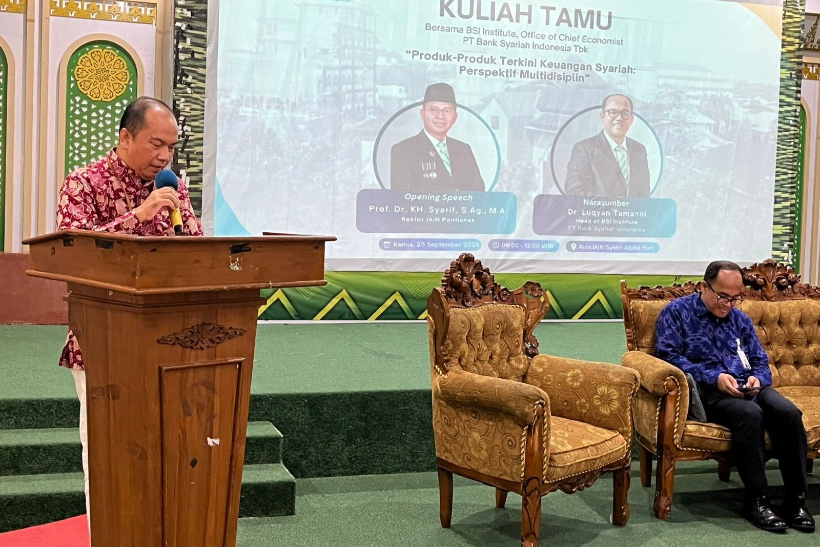 Pontianak, 25 September 2025 – Institut Agama Islam Negeri (IAIN) Pontianak bersama Bank Syariah Indonesia (BSI) menggelar seminar bertajuk “Produk Terkini Keuangan Syariah: Perspektif Multidisiplin” di Aula Arani IAIN Pontianak, Kamis (25/9). Kegiatan ini dihadiri pimpinan perguruan tinggi, praktisi perbankan syariah, akademisi lintas bidang, serta ratusan mahasiswa dari berbagai program studi.